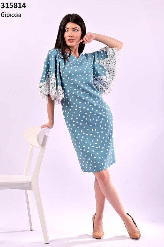 красивое платье на лето, свободного кроя, бирюзового цвета в горох, платье необыкновенно утонченное и женственное благодаря кружеву на рукавах.