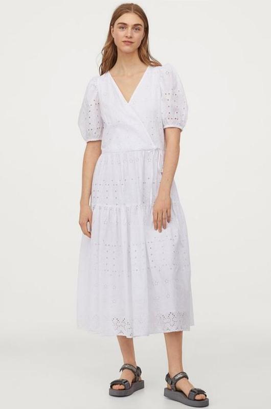 Белое хлопковое платье миди с вышивкой и люверсами. Платье с искусственным запахом и V-образным вырезом из красивой английской вышивки, полностью на подкладке. Узкая завязка на одной стороне талии и расклешенная многоярусная юбка. Немного большемерит. Новое, без бумажной бирочки, аутлет. Замеры по запросу...