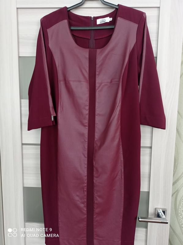 Дуже гарне плаття, якісна крепкостюмка з вставками з екокожі. Фото не передає реального кольору: в реальності - насичений бордовий колір. Одягалося один раз, тому етикетка відсутня. Крій: плаття - футляр. Ззаду щліца. Розмір 52, але в реальності 50 розмір.