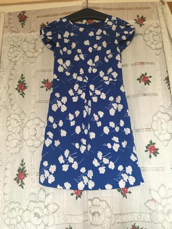 Летнее платье -фирменное,полиэстер,на синего цвета подкладке, синее поле платья разбросаны белого цвета или- то цветы,чи- то листочки, короткие рукавчики с накладкой двух частей, спереди от талии по центру спадает складочка,обем в поясе-72см.,длина платье-88см.,ширина в плечах 36см.