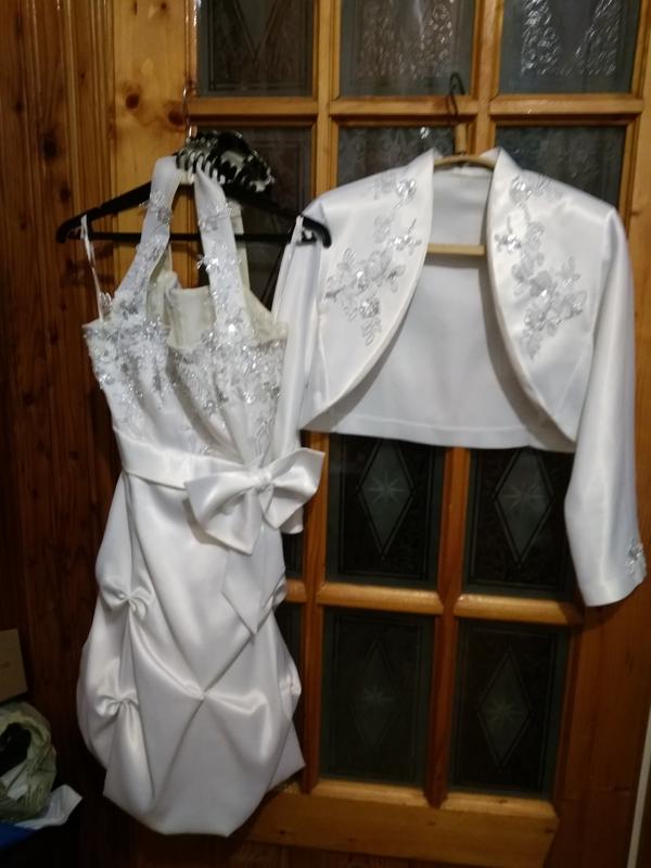 Плаття: довжина-95см.,обєм грудей-86см.,талія-80см. Піджачок: довжина-37см.. обєм грудей-90см.