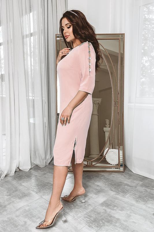 Состав: Полиэстер – 90%, вискоза – 10% Сезонность: весна,осень,зима Размерный ряд: 48-58 Материал: креп роза Платье с разрезами по среднему шву рукавов и в боковых швах, соединёнными между собой камнями. pl4-094.59