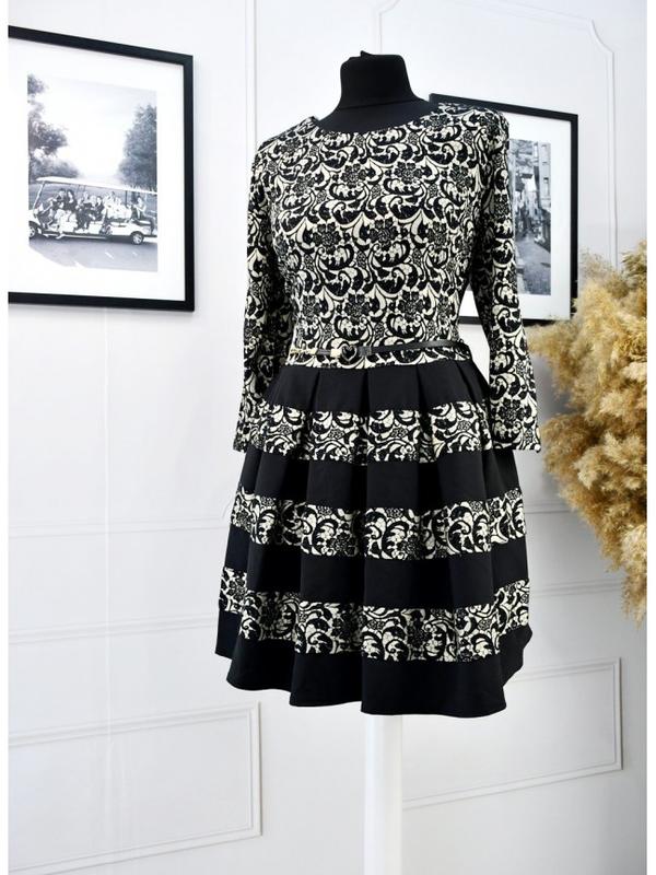Сукня на урочистості з жакарду Жардова сукня- це про свята, урочистості, події. Тканина щільна, з витканим малюнком. Якнайкраще підійде для урочистих подій. Сукня в класичному крої, спідниця кльош комбінована з однотоними, атласними вставками чорного кольору. По спинці масивна, золотава блискавка. Сукня не потребує додаткових прикрас. Вона довершена в своїй ошатності. Сукня всесезон. В комплекті зйомний, привабливий пасок. розмір 48 виробник Туреччина склад: 73% поліестер, 22% віскоза, 5% еластан Тканина Жакард Еластичність Середня Щільність Висока - виміри у лежачому вигляді: плечі – 39 см рукав - 45/30 см ОГ – 80 см От - 70 см ОС - 140 см довжина – 86 см - параметри манекена: ОГ – 82 см ОТ - 58 см ОС - 90 см