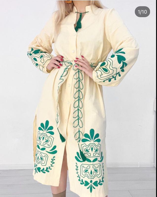 Бежевое платье с зеленой вышивкой Размеры S и М полуобхват: Размер S грудь-51см талия-свободно стегна-57см рукав-62см длина платья-118см Размер М грудь-53см талия-свободно стегна-60см рукав-64см длина платья-118см