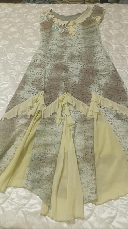 Платье из стрейчевого гипюра, невозмутимого дизайна, на стрейчевой подкладке. Украшено кружевом ручной работы и камешками разного цвета, придающего платью шикарность.Одное плечо украшено камушками и кружевом, и прочее небольшим рукавом.Ткань красиво облегает состояние.Размер платья 40/LX.Длина платья 1,35.П/о груди 48см.П/талии 45см.Продаю только свои вещи.