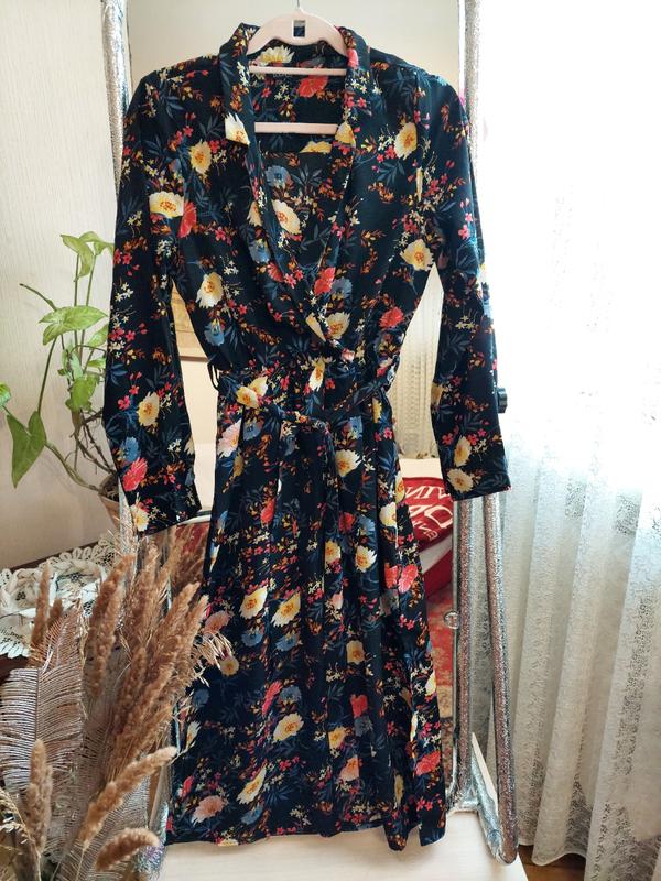 Чёрное платье миди с длинным рукавом в цветочный принт boohoo(размер 36)