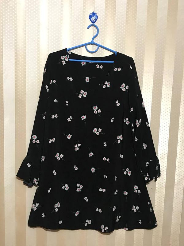 Красивое минималистичное платье из 100%вискозы с длинным рукавом George. Платье с V образным вырезом, А силуэта, ассиметричного кроя с длинным рукавом. Рукав заканчивается манжетом на завязке и широкой оборкой. Фон черный по нему разбросаны белые цветы. Юбка платья ассиметричная скошенная Платье хорошо впишется в весенне летний гардероб. Подойдет как на свиданье, так и на каждый день. Платье в идеальном состоянии без дефектов. На бирке указан размер 12. Подойдет на размер М- L. Замеры: плечо 8, длинна рукава 63, ПОГ 52, ПОБ 57, высота по одной стороне 87, по другой 93.