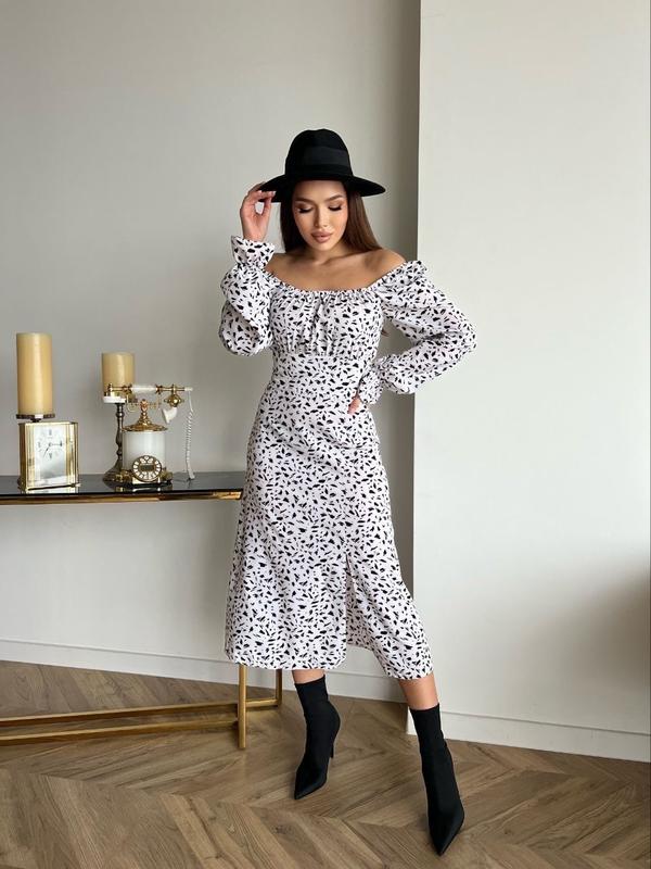 Платье миди с корсетной талией расклешенное с разрезом в цветочек м открытыми плечами голу...