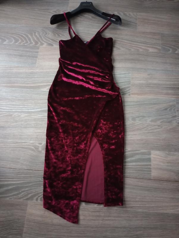 Бархатное вечернее платье миди на запах тянется по фигуре до 10 см ПОГ 32 см ПОТ 31 см ПОБ 41 см длина от верха шлейки до низа ( зад) 110 см спереди размер 37 см от талии состояние новое Евросток