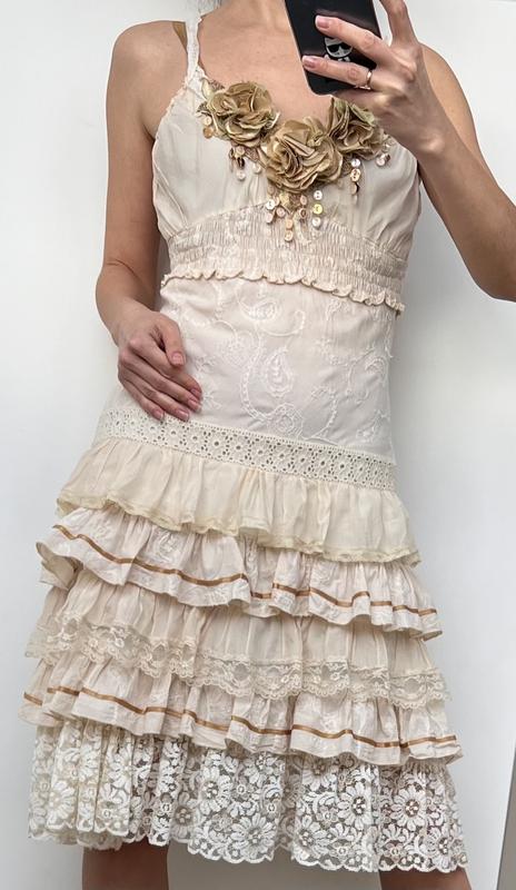 Нарядное платье в отличном состоянии, состав шелк (silk) и хлопок (cotton). Цвет бежевый. Длина 102, пог 44, пот 38, поб 48