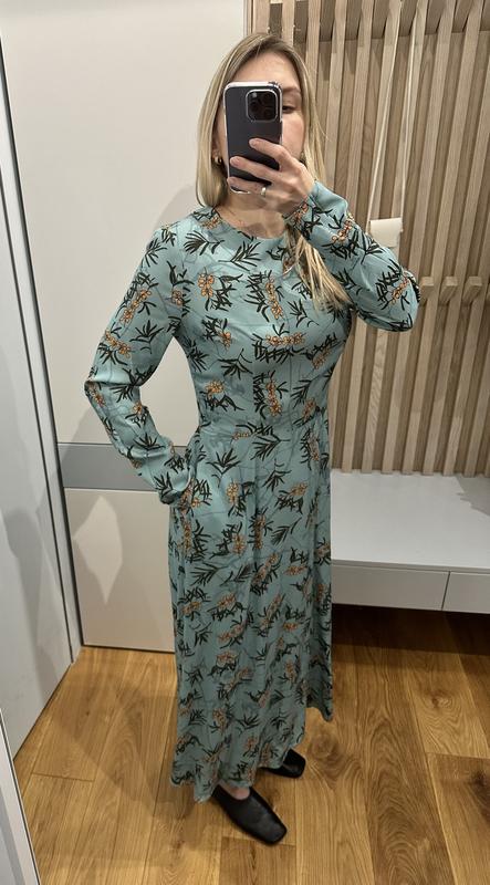 Сукня довжини міді в квітковий принт від українського бренду Must Have Голубого кольору, в квіти, розмір S, 100% віскоза. Застібається ззаду на блискавку.