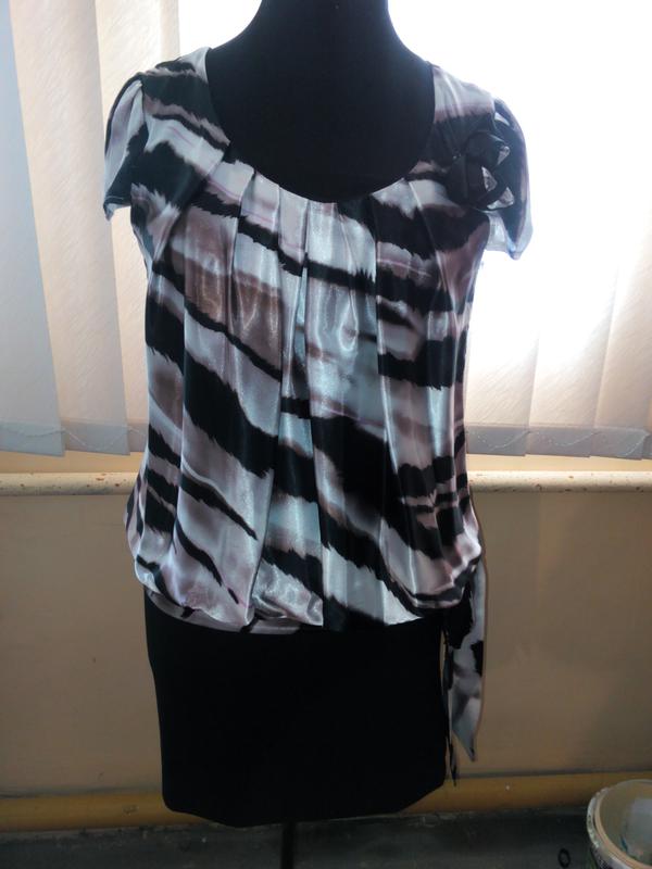 Очень красивое нарядное платье. Пошив Турция, очень качественный . Размер - 46. Состав 95 % polyester, 5 % elastan. На втором фото, по низу манжета завязывается большой бант, а на последнем фото постаралась передать брошь в виде цветка. Фасон платья не плохо будет смотреться на женщине которая хочет спрятать свой животик. Замеры: длина - 88 см., ПОГ - 51 см., ПОБ - 52 см.