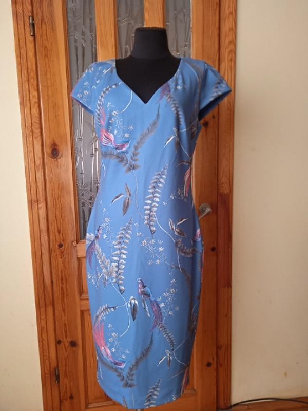 Очень качественная ткань. Подкладка вдоль всего платья. Ткань тянется, достаточно тяжелая на металлической молнии. Длина 106 см. Полуобхват по груди 44 см. по бедрам 50 см. Рукава 11 см. Плечи 36 см. Длина разреза сзади 23 см.