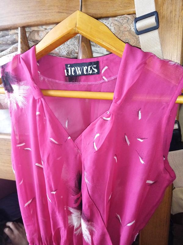 Нежное шифоновое платье, пишет размер 44. На поясе на резинке, верх на запах. Верх осветляется, низ имеет подкладку. Тканина не тянеться. Пог - 46 см, пот - 35 см в растянутом виде, длина до талии - 43 см, длина от талии - 70 см, плечи - 35 см.