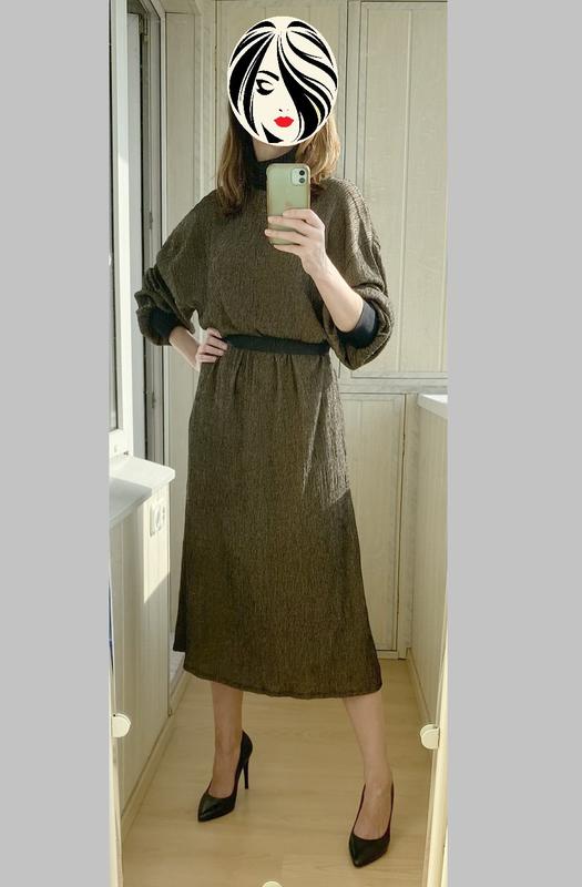 Очень красивое платье. Подойдет как на выход, так и на каждый день. Размер универсальный. Свободный крой. Интересная структура ткани. Пояс спереди вшит, сзади завязывается. Цвет как на 3 и 4 фото. Выглядит дорого. Длина - 120 см. Рукав от горловины и до конца манжета - 73 см. Полуобхват талии - максимум 52 см. В груди свободно.