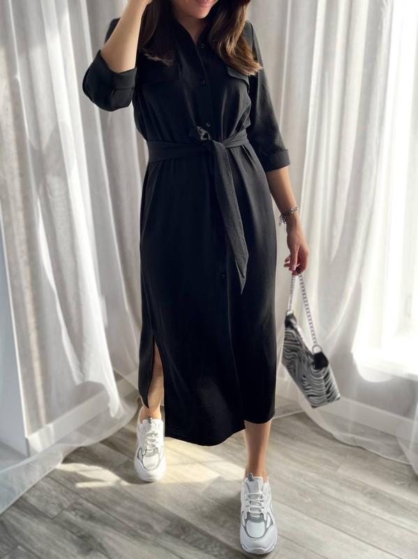 Плаття Арт 545 Тканина американський креп Колір чорний, зелений, бежевий, графіт Розмір 42-44,46-48,50-52 Ціна 640 грн Сукня сорочка, застібається на гудзики, рукав 3/4, з боків розрізи, комір стійка Пояс з шкірозамінника 80 грн