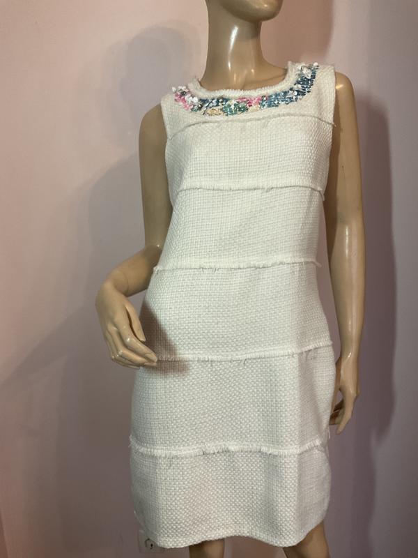 Интересное качественное платье. Тканина не тонка. Подкладка. Замок в спинке. Декор по горловине. Без дефектов. Замеры в груди 47 см в талии 43см в бедрах 48см длина 86см. Рекомендую на М. Смотрите замеры цвет молочный 26:2:23