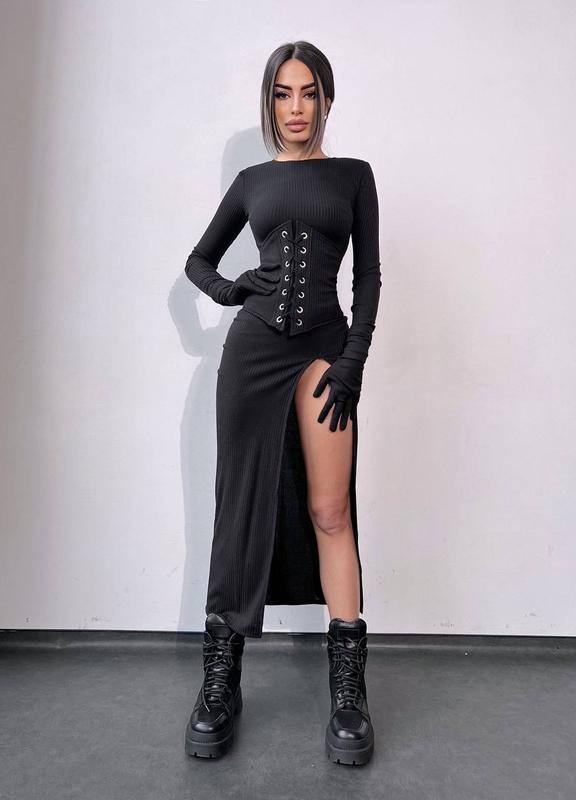 Комплект: трикотажне плаття- міді + корсет + рукавички ▫️тканина: трикотаж рубчик ▫️розмір: S та М