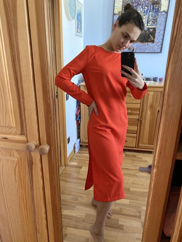 Новое платье, облаченное один раз, ткань очень приятная,цвет коралловый, размер М, с одной стороны распорка, длина по икры, покупка за 2500