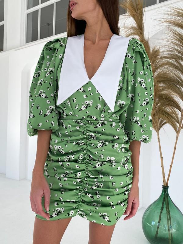 Арт 471 Сукня Kamilla Вишукане, стильна сукня, виконане в трендовому стилі зі складаннями Пишний рукав 3/4 завдовжки V-подібне декольте з білим коміром Застібається по спинці потайною блискавкою Тканина: шовк Армані Розмір: S, M
