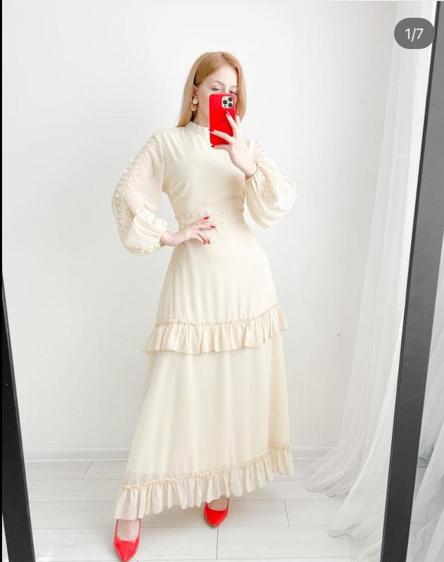 бежевое платье 850грн размер L полиэстр полуобхват: грудь-50см талія-40см стегна-55см рукав-60см длина платья- 145см