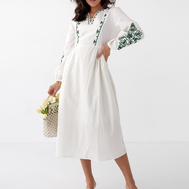 Бавовняна сукня-вишиванка СС-2402 Модель с V-образным вырезом горловины и объемными рукавами, отрезная по талии. Предусмотрена подкладка. Размер: 44,46,48 Длина: 116-120см(в зависимости от размера)