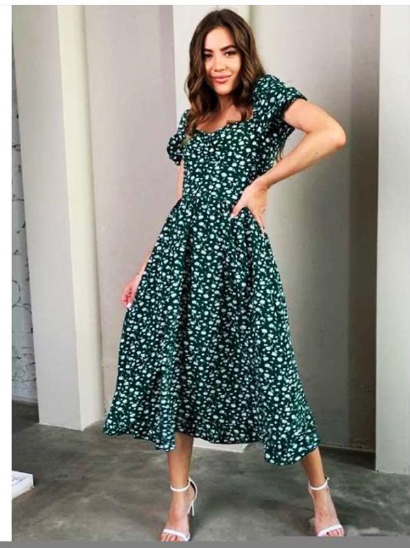 Нова сукня (бірок немає), не носилася, зроблена в Україні. Яскрава та приємна до тіла. Розмір наш 46-48, думаю, на 44 буде теж ОК.