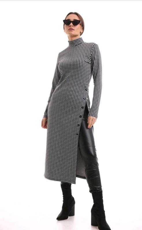 Трикотажное платье с модным принтом «гусиная лапка» - это женственность и шарм. Полуоблегающий силуэт подчеркнет приманки фигуры и скроет мелкие недостатки, если они есть. Длина миди сделает фигуру стройной, а высокий разрез на кнопках придаст сексуальности. Воротник – стойка, рукава – втачные, длинные. Кнопки - от талии, по линии бедер, благодаря чему разрез можно увеличивать или уменьшать. Теплое, удобное и очень элегантное платье пригодится при любой ситуации