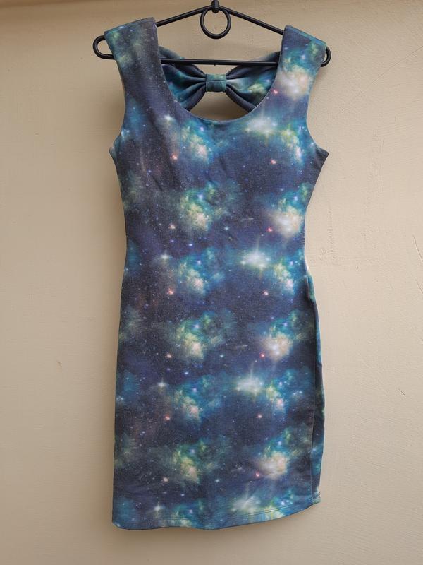 Стрейч платье под джинсы с нежным космическим принцем. Имеет интересную модель спинки. Плечи 37см, ог от 80 до 92см. от 66 до 80см, об от 84 жо 100см. длина 81см