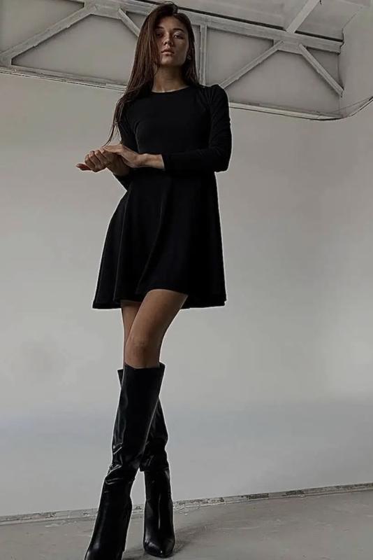 Базовое платье в рубчик трикотажное. Удобное повседневное женское платье - колокольчик свободного кроя длины миди, выполненное из фактурного трикотажа с длинными рукавами. Перчатки снизу немного расширены, как фонарики. Размер универсальный. Длина платья - 83 см. Длина рукава от плеча - 60 см. НОГ 46 см Красиво тянется. Материал - креп-дайвинг (вискоза) эластичный.