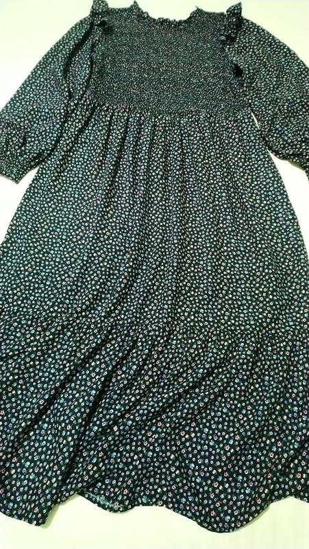 Шикарное ярусное платье миди большой размер натуральное мелкий цветочный принт верх до талии в мелкую резинку длинный рукав нежная шелковистая ткань очень комфортно в носке состояние новой вещи ПОГ 48 тянется до 53 ПЛЕЧИ 39,5 РУК 65 ПОТ 44 тянется до 47 БЕДРА 61 ДЛИНА 126