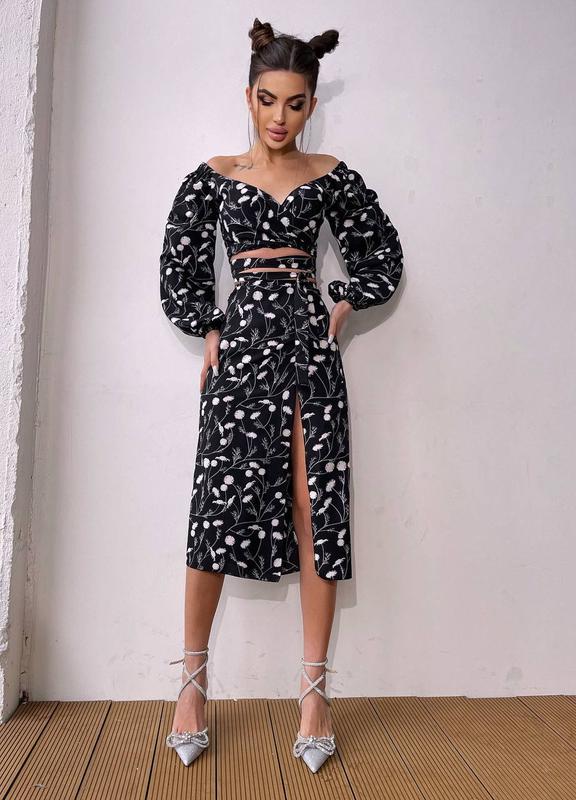 Комплект: топ із зав'язками на талії + спідниця міді з розрізом ▫️тканина: софт ▫️розмір: S та М