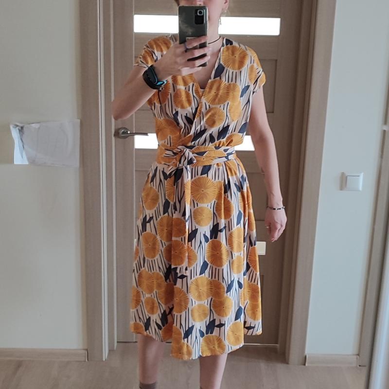 Положительное платье украинского производителя Grass с широким поясом. На размер 46-48. Длина от горловины до пояса - 46 см Длина от пояса до края юбки - 75 см Ширина от проймы до проймы по спинке - 60 см