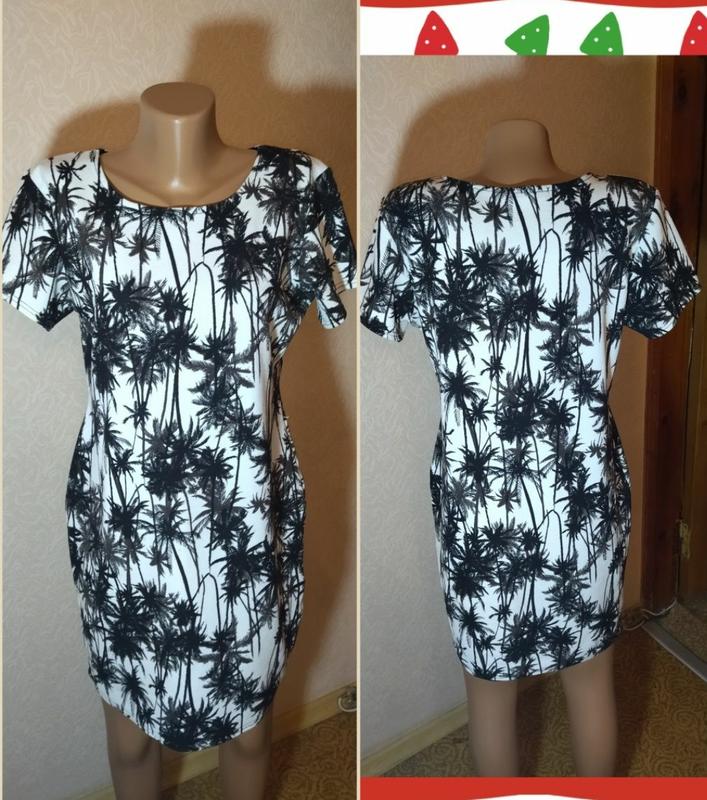 Платье чёрно-белое с пальмами размер UK 14 евро 42, торговая марка select, длина платье 88 см, ширина под мышками 52 см. Полуобхват талии 44 см, полуобхват бёдер 49 см,, ширина плеч по спине 40,5 см, длина рукава 16,5 см, по внутреннему шву 7,5 см
