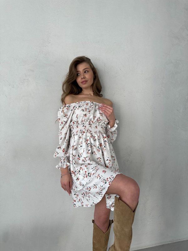 Модель 5395/31 Жіноча сукня з подвійною спідницею Розмірний ряд S,M,L,XL Тканина софт, дуже м’який та приємний на дотик Кольори блакитний горошок; чорний горошок; білий квіточка; чорний квіточка Сукня має резинки на плечах, завдяки чому можно носити з відкритими плечима, що додає образу елегантності та романтики. Рукава сукні довжиною до ліктя, а саме ¾, додають образу додаткової жіночності та стильності. Ця сукня підходить для різних заходів, таких як вечірка, день народження, весілля, або просто для повсякденного використання.