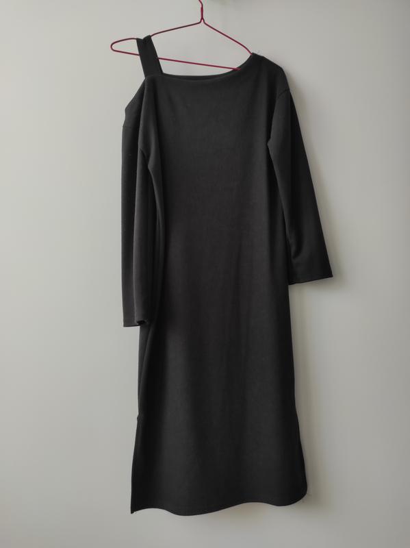 Платье женское. Черного цвета. Ткань - мелкий рубчик. На длинный рукав, одно плечо открытое, на бретельке. По бокам имеются распорки. Размер s-m.