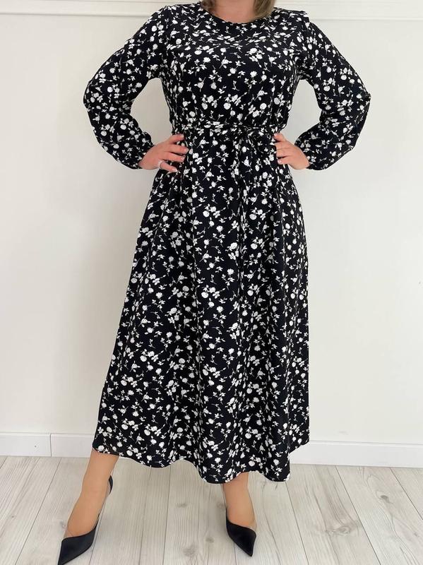 Арт. 2753 Тканина: софт принт Цвет: голубой, мятный, красный, черный Размер: 48-50, 52-54, 56-58 Платье с длинным рукавом,рукава и талия на резинке, пояс не притачен.