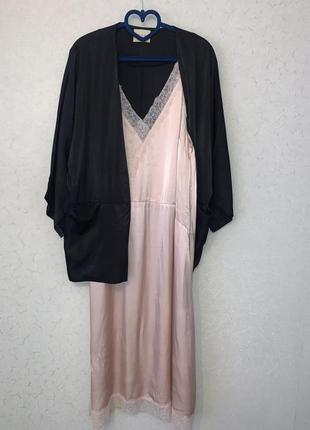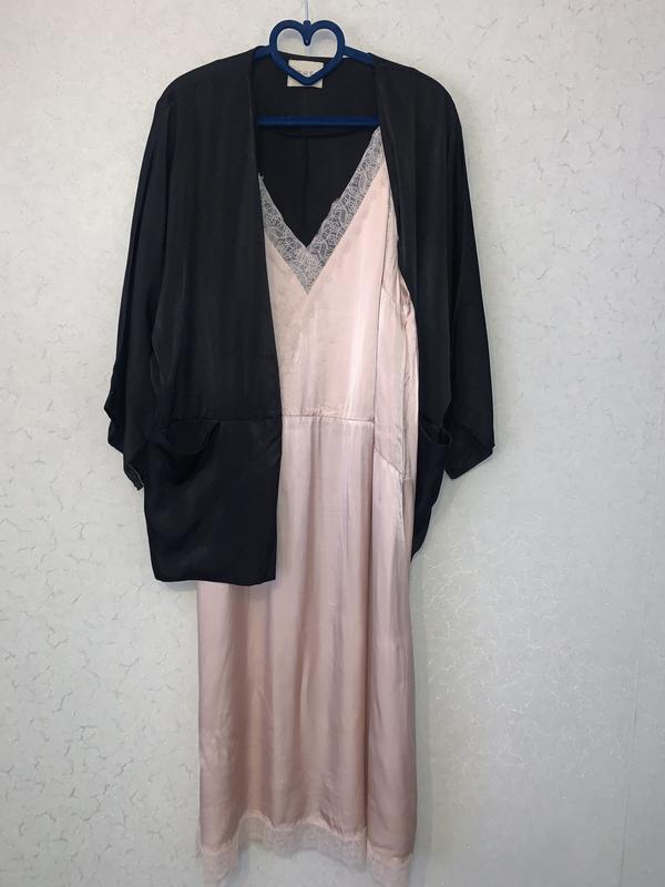 H&M Платье в бельевом стиле Платье длиной миди из атласа с кружевными деталями, швом под бюстом, V-образным вырезом сзади с кружевной отделкой и прямой юбкой с кружевным краем. Без подкладки. Ткань не тонкая, не будет прилепить к телу К нему есть атласное кимоно (подделки уточняйте) Размер евро-40 Вискоза Идеальное состояние Расстояние между подмышками-53, на ог не более 107 Пос -64 Длина-120 от плеча