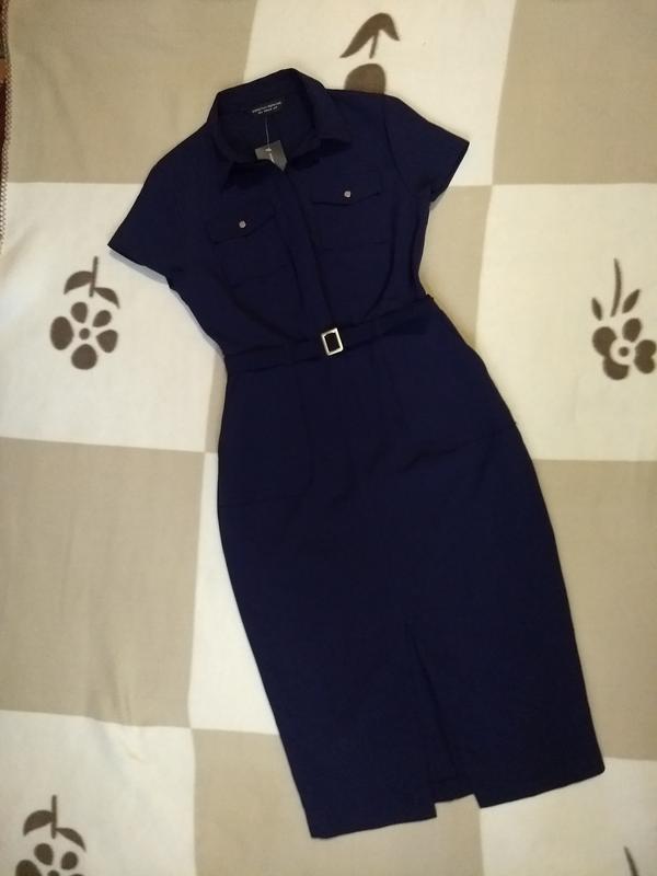 Стильне офісне темно-синє плаття міді / плаття-сорочка Dorothy Perkins з кишенями і розрізом спереду. Перед застібається на гудзики, збоку на потаємну блискавку, з поясом. Кишені на грудях і з боків, без підкладки, тканина трохи тягнеться. Довжина сукні 105 см, ПОГ 44-47 см, ПОТ 35-37 см, ПОБ 48-50 см, довжина до талії 37 см, плечі 36 див. Плаття нове, з етикеткою, є запасні гудзики. Але, на жаль, є дефект - затяжка ззаду на спідниці (див. два останні фото). Як варіант - можна вкоротити.