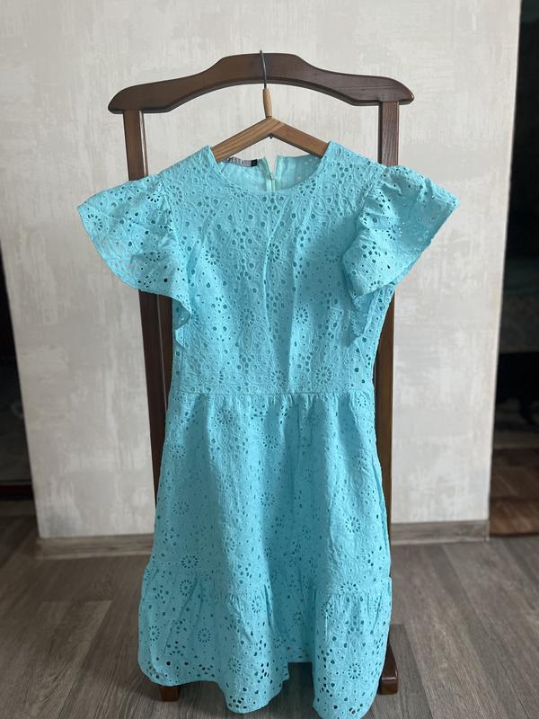 Платье ниже колена. Длина 95 см ниже колена. Тканина прошва. Очень красивое. Имею фото на мне. Скину в ЛС.Низ волан.