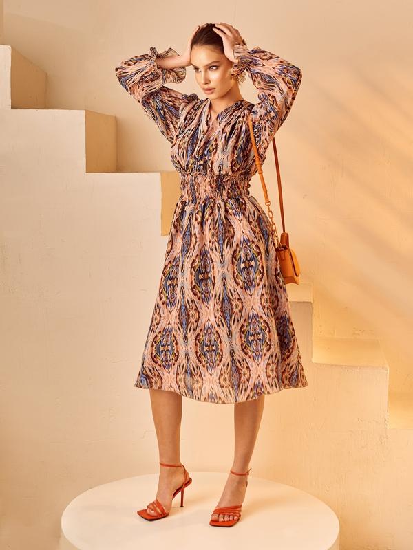 🔥Воздушное платье из принтованного шифона. Широкая вафельная резинка выше талии, с оборкой сверху. На лифе четыре функциональные пуговицы, которые так же являются декором. Сборки на плечах, длинные пышные рукава, присборенные на резинку. Отрезная талия с объемной юбкой. ✔Размер:44,46,48,50 🪡длина по спинке – 111 см 🪡длина рукава (от плечевого шва) – 62см 🧵Состав: 100% полиэстер 🧵Состав подкладки: 100% бавовна 🧵Материал: Шифон 🎨Цвет: преобладает оранжевый 💳Цена 1590грн Арт42475 ❗❗Для заказа и детальной информации ndем в дырэкт💌, или комментарии ⤵️