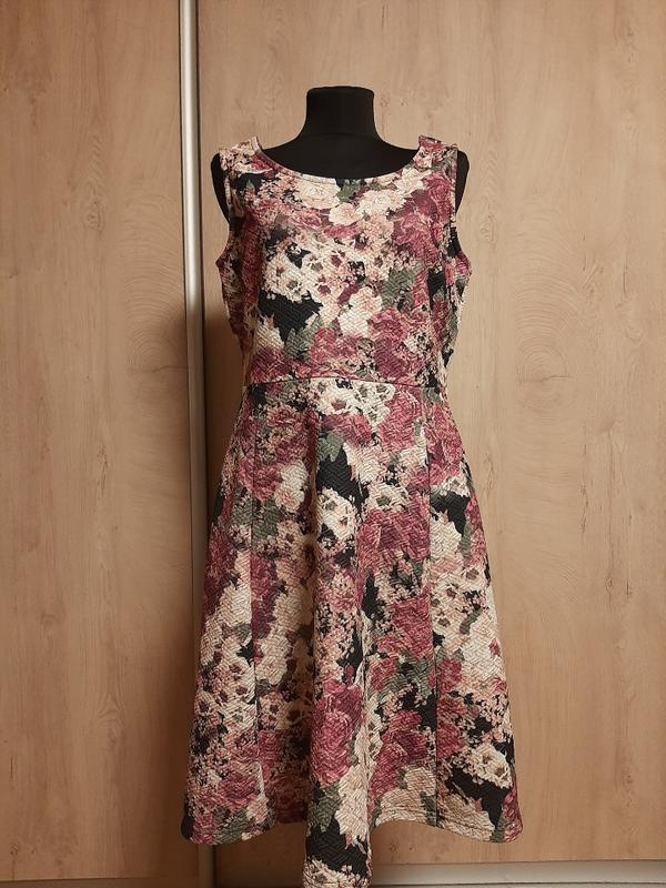 Красивое платье с цветочным принтом. Трикотаж полиэстер, ткань тянется. Размер М. Замер: плечи 38см, пог 48см, длина 99см, длина верха 39см, юбка 60см, пот 41см, поб 62см. Крой с отрезной талией, расширенная юбка.