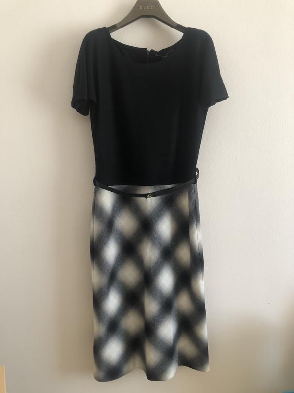 Сукня бренду Gucci, розмір М. 100% шерсть. Довжина трохи нижче колін. На тканині був незначний дефект, забрали, додавши виточки на спідниці. Фото є, в ціні враховано. Шкіряний брендовий ремінець у комплекті. Нова, не була у використанні. Оригінал