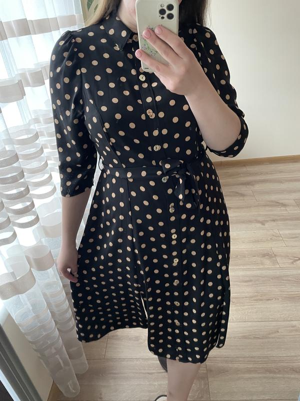 Женское миди платье, размер 42(ХЛ): Длина - 111см, полуобхват груди - 49см, полуобхват талии - 44см, полуобхват в бедрах - до 63см, длина рукава - 45см. Есть поясок в тон к платью. Красивые акцентные пуговицы, есть еще запасной. Материал - 100% полиэстер