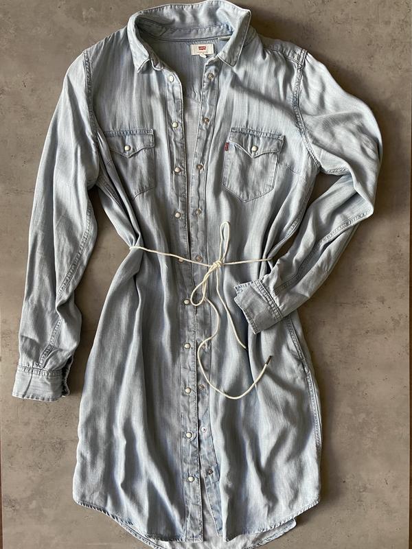 Сукня LEVIS Колір: блакитний джинс Розмір: М Склад: 100% ліоцел Талія: 45 см Стегна: 50 см Плечі: 37 см Рукав: 62 см (від шва) Є кишені