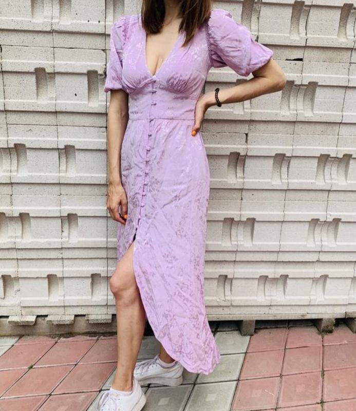 Шикарное платье, выбитый узор на ткани, цвет 😍💜💜, красиво подчеркивает талию и грудь, пуговицы из ткани, рукав-фонарик)