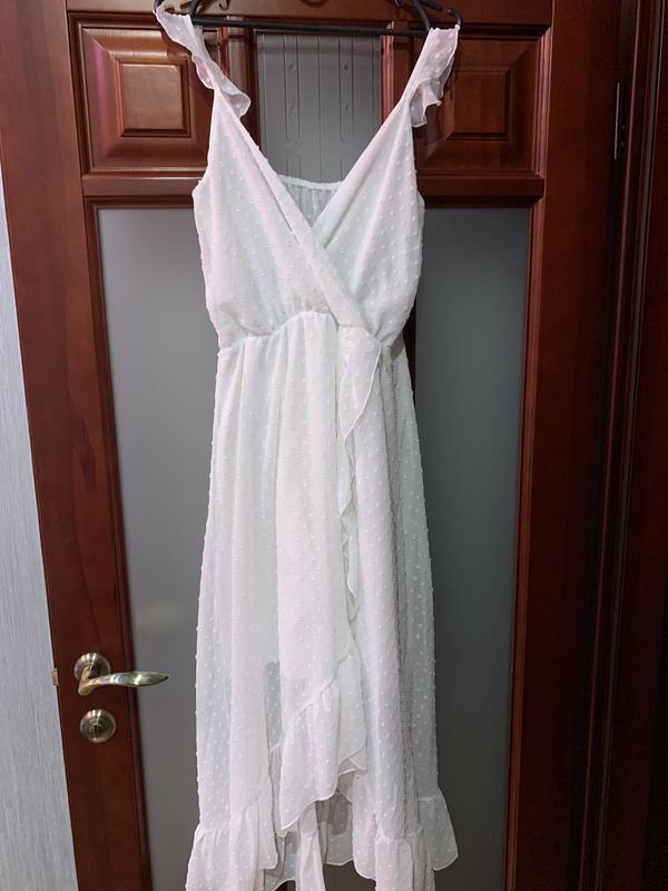 Белоснежное платье с имитацией на запах. Ткань легкая и нежная. Длина по спинке от плеча 125, спереди от талии 58, полуобъём груди 40-48,полуобъем талии не растянутом 30, растянутое 40. Наделась на фотосессию