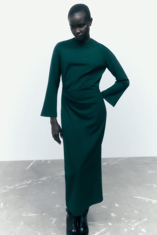 Платье миди с круглым вырезом, длинными рукавами. Сборки по бокам на талии, разрез сзади. Застегивается на потайную молнию сзади. 63% ПОЛИЭСТЕР 33% ВИСКОЗА 4% ЭЛАСТАН Плечи-40 см Ог-44,5 см