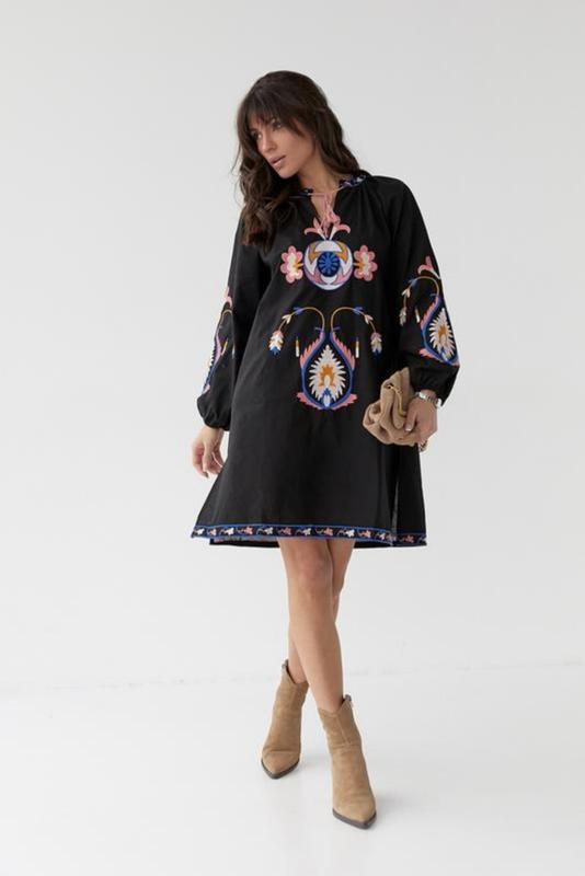 Производитель Турция. У модели длинные рукава реглан внизу собраны на резинку, а посередине украшены цветочной вышивкой. Окантовка круглой горловины, основная часть платья, а также манжета по низу изделия также украшена вышивкой. Спереди горловина дополнена небольшим разрезом с завязками. Состав ткани - 80% хлопок, 20% полиэстер Размер С ( ширина между проймами рукавов - 55 см, длина - 92 см, рукав от горловины - 65 см, по внутреннему шву - 44 см, ширина по бедрам - 60 см)