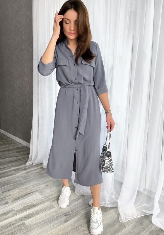 Платье арт. ha. 545 Ткань: американский креп Цвет: черный, зеленый, бежевый, графит Размер: 42-44, 46-48, 50-52 Платье рубашка, застегивается на пуговицы, рукав 3/4, по бокам разрезы, воротник стойка